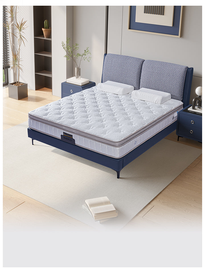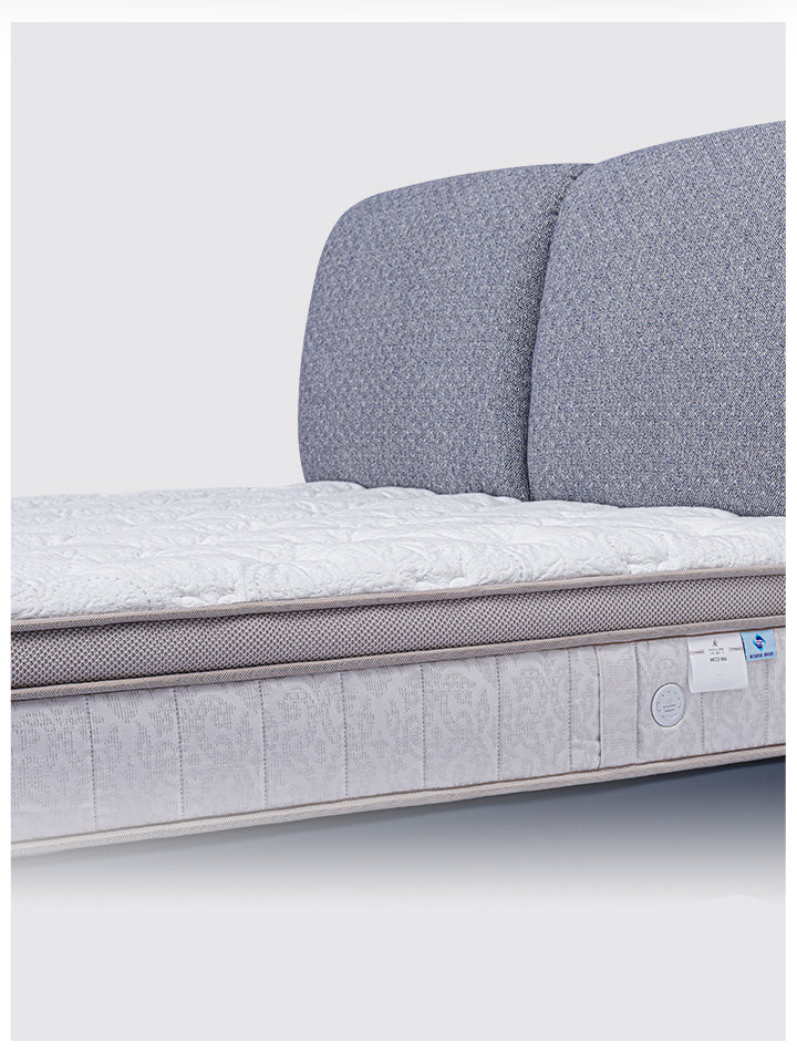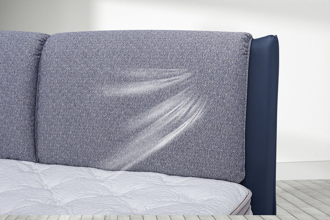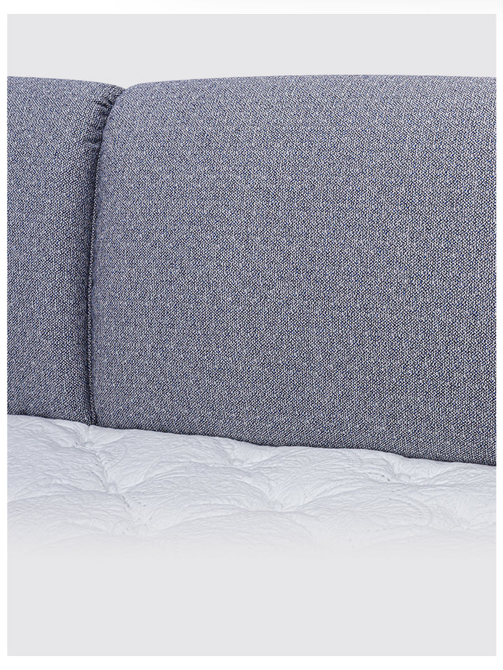 The "Cloud Sea" bed frame features a segmented, plush headrest that promises a languid embrace. Its overhanging design creates a visual flow akin to natural waves. Upholstered in a crisp royal blue cotton-linen fabric, it offers a cloud-like comfort, allowing you to recline in style and relaxation, as if floating above a tranquil sea of clouds.