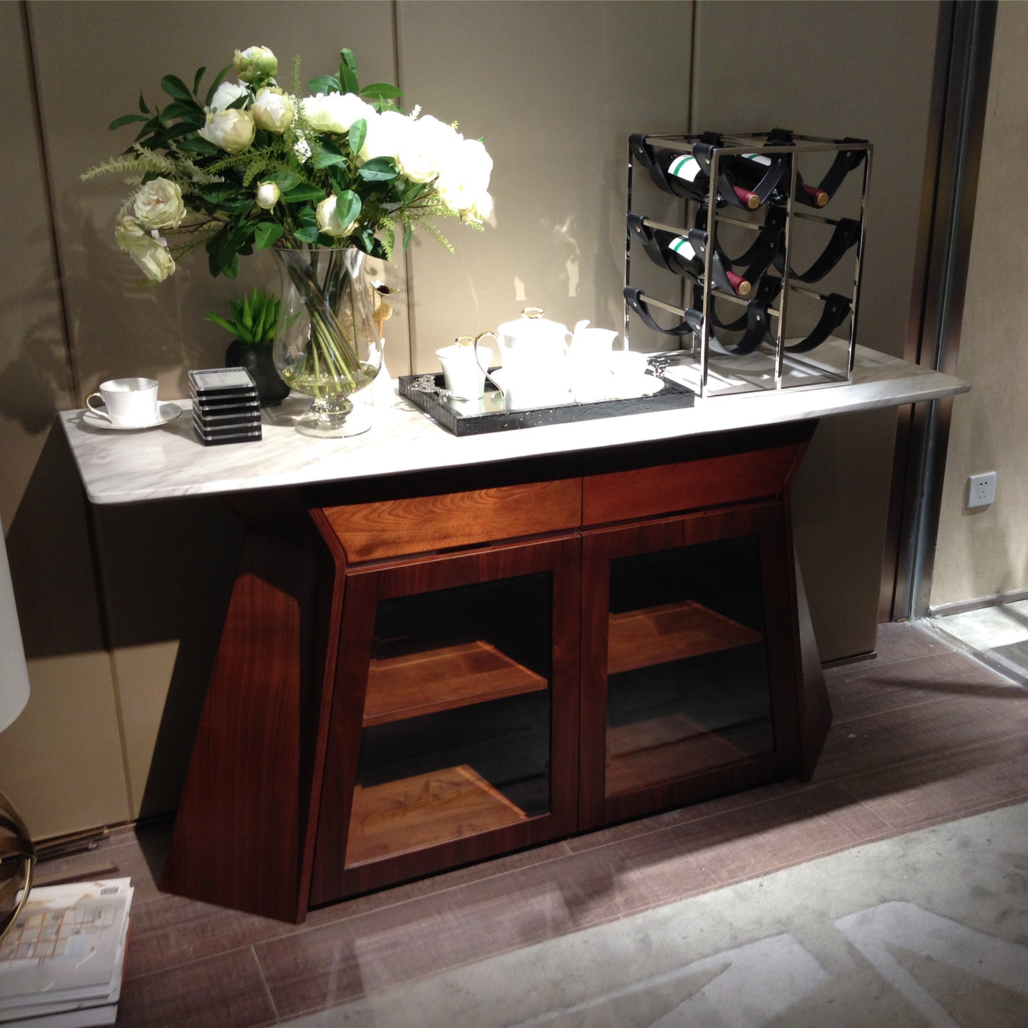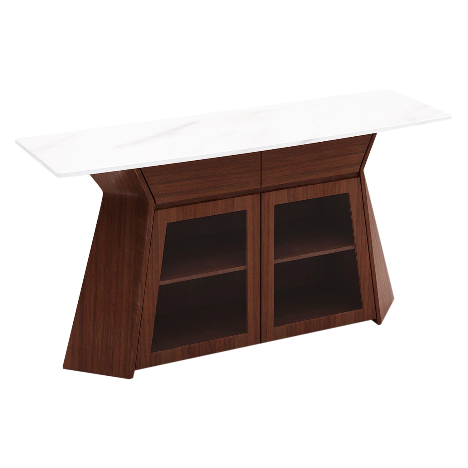Introducing the LMC1 - 1358 Sideboard Cabinet, a captivating statement piece that seamlessly blends contemporary design with luxurious materials. This unique sideboard features a striking geometric base crafted from rich walnut veneer, accented by a sleek Jazz White marble top for a touch of modern elegance.