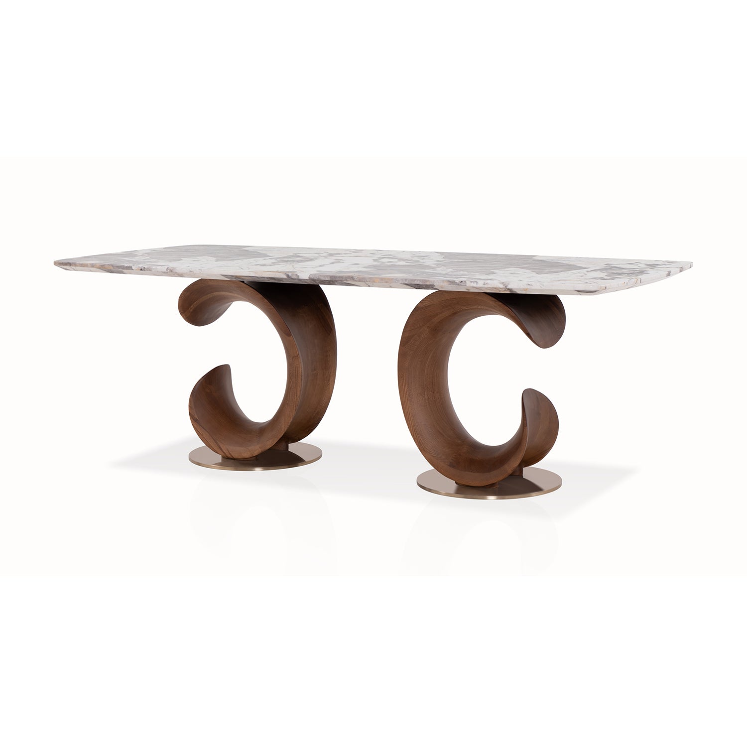 The elegant and sturdy dining table features a natural marble with Pandora marble paper table top and solid wood base. Its unique double C-shaped table base adds stability and enhances the elegance of this dining table, making it the perfect addition to any dining space.