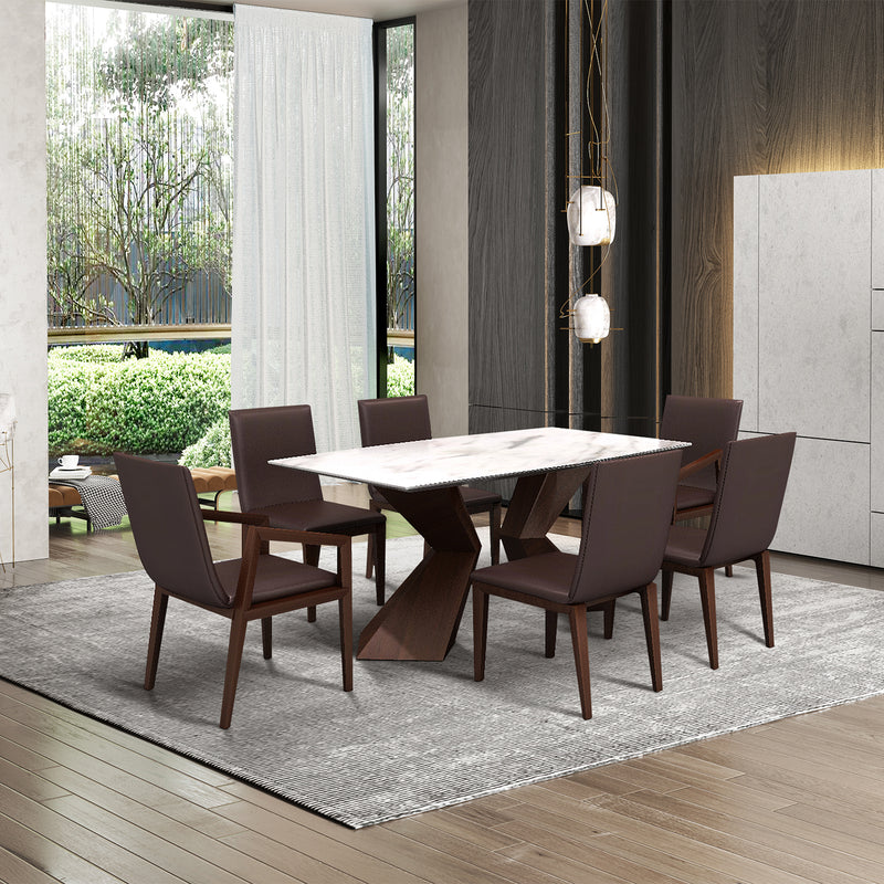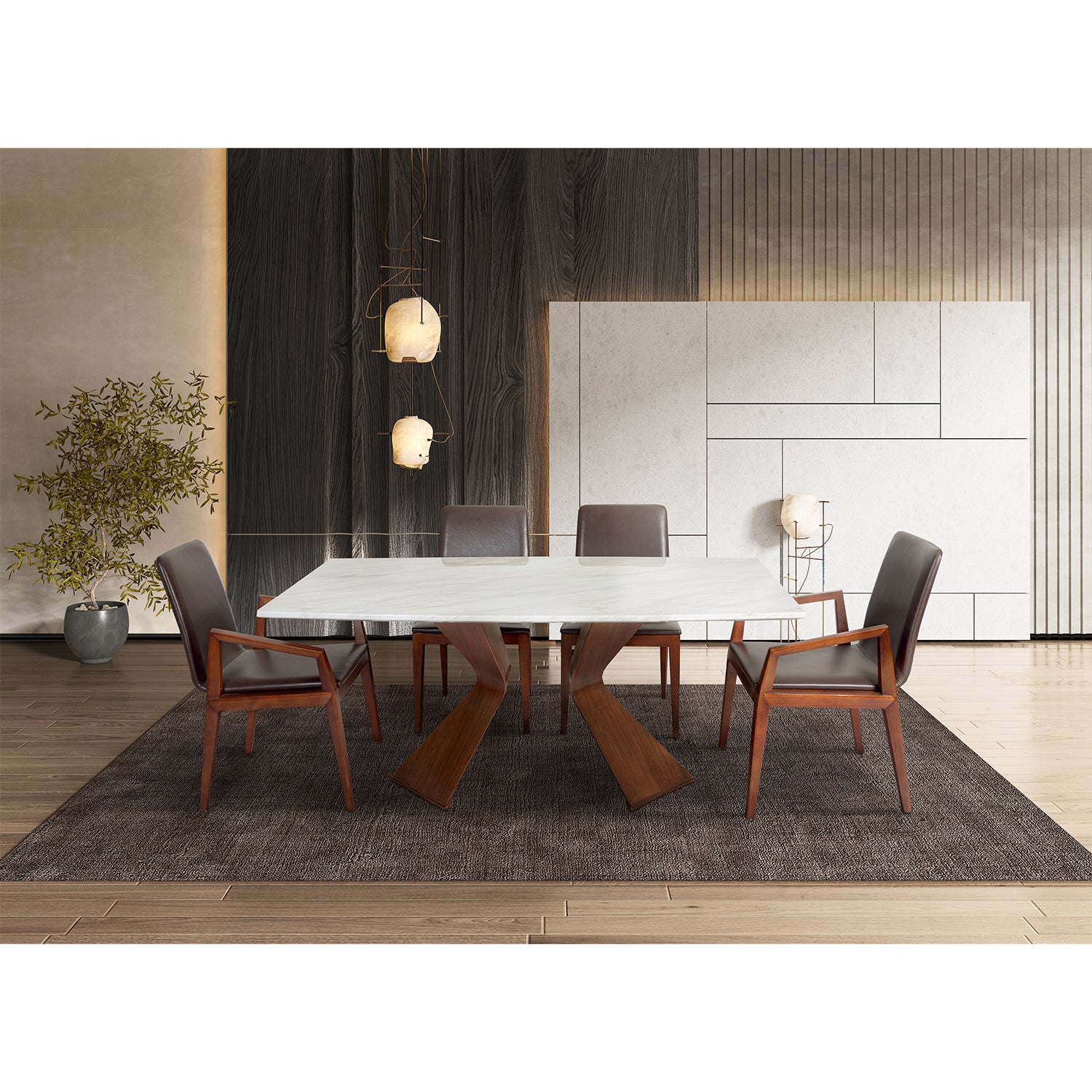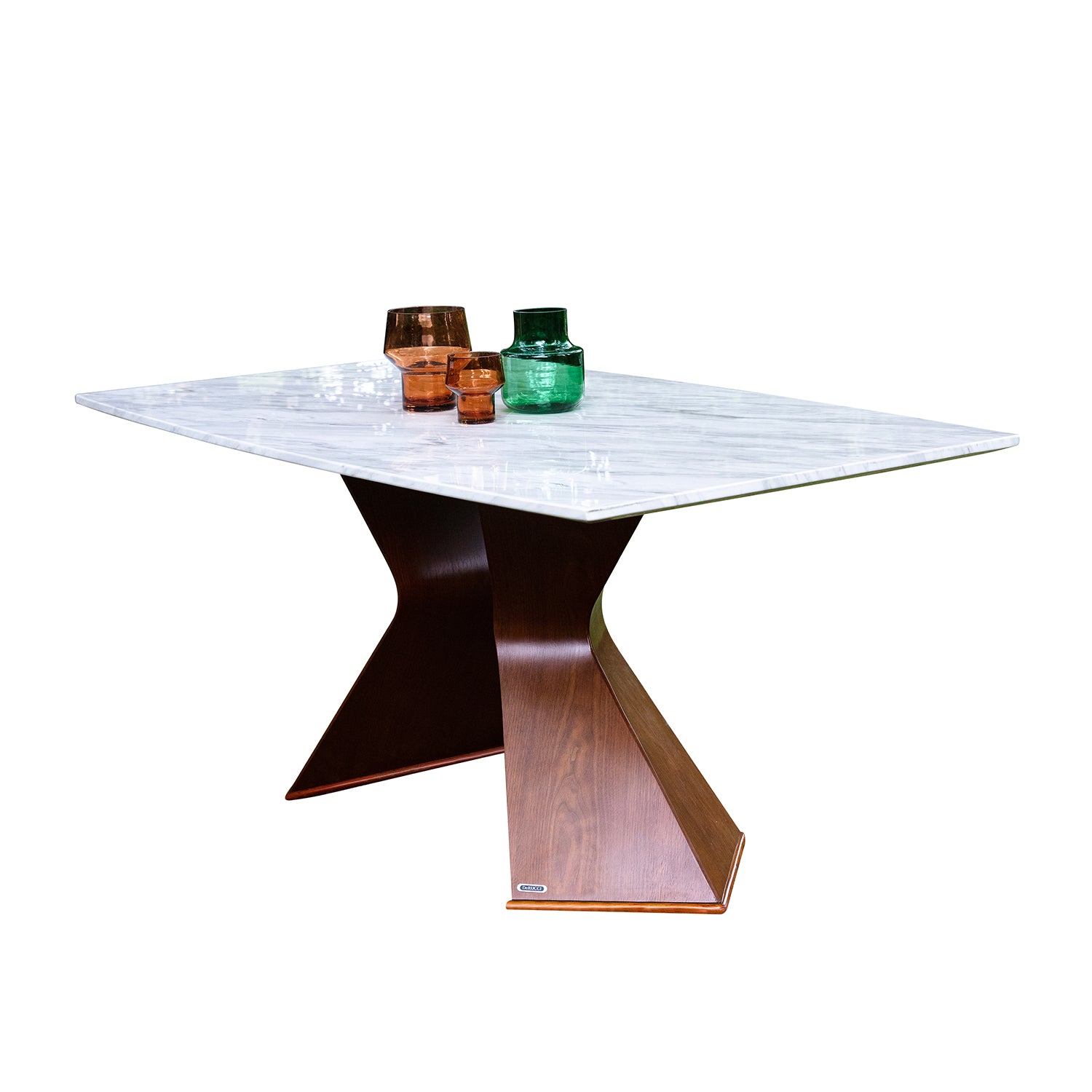 A sleek natural marble with white marble paper table top, supported by angled legs which have been finished in a rich timber veneer, create the striking, artistic profile of our