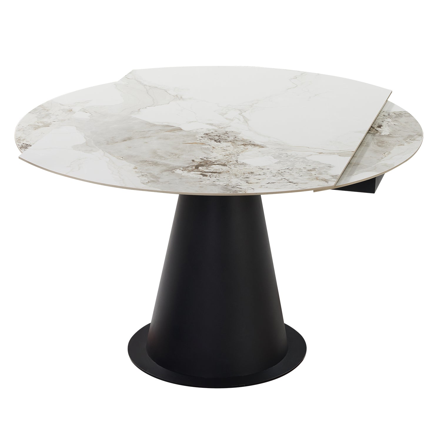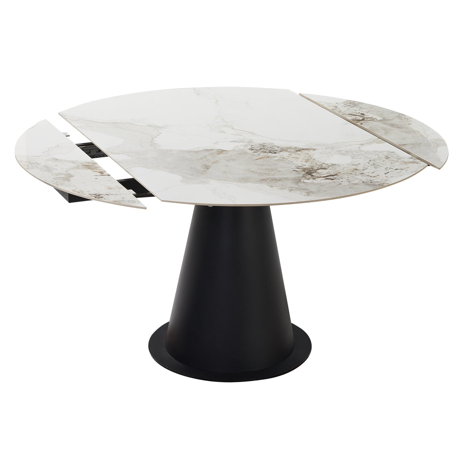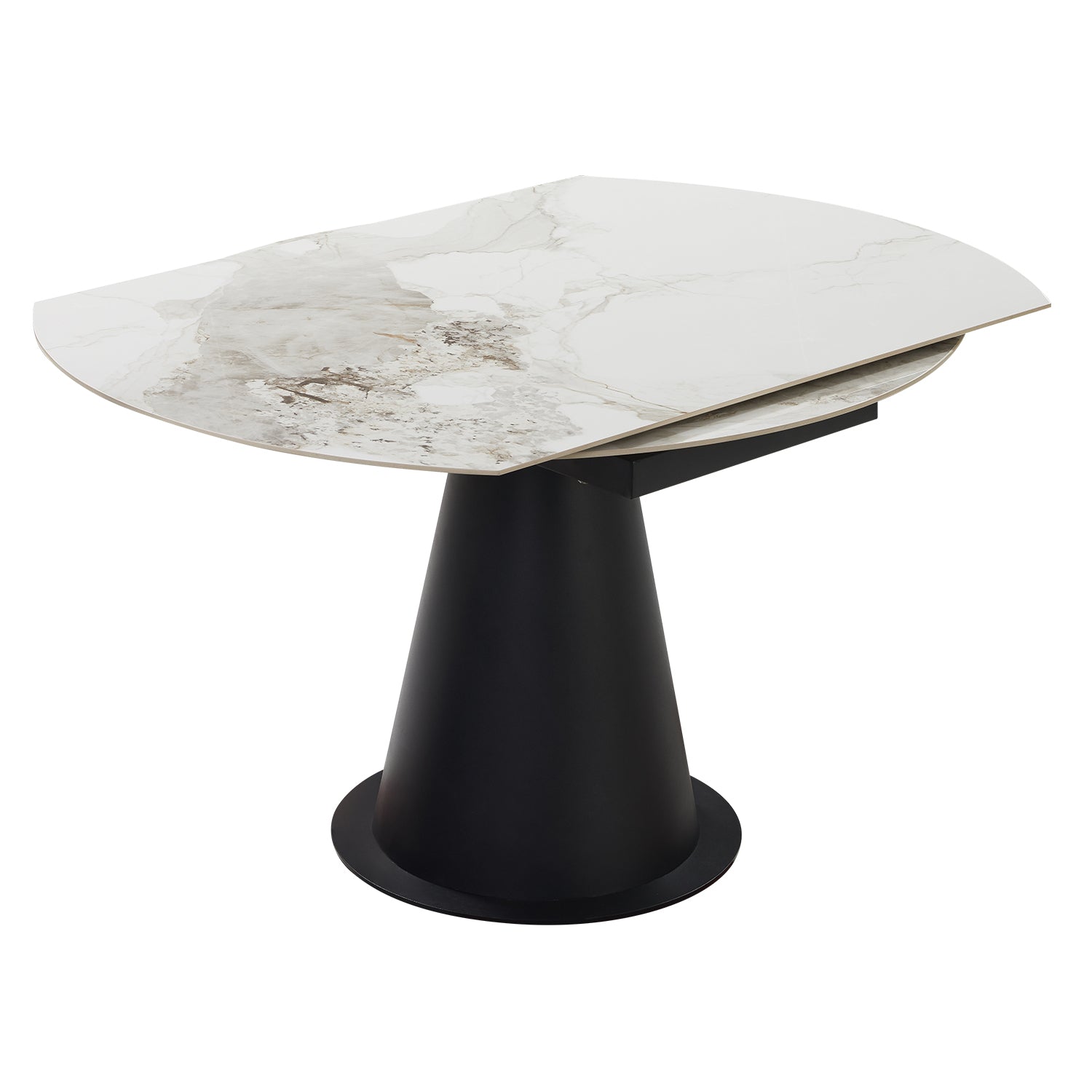 The space-saving extendable dining table seamlessly transitions from round to square, just rotate the table, making it perfect for any space or occasion. Its rock plate surface offers exceptional durability, scratch resistance, and heat resistance.