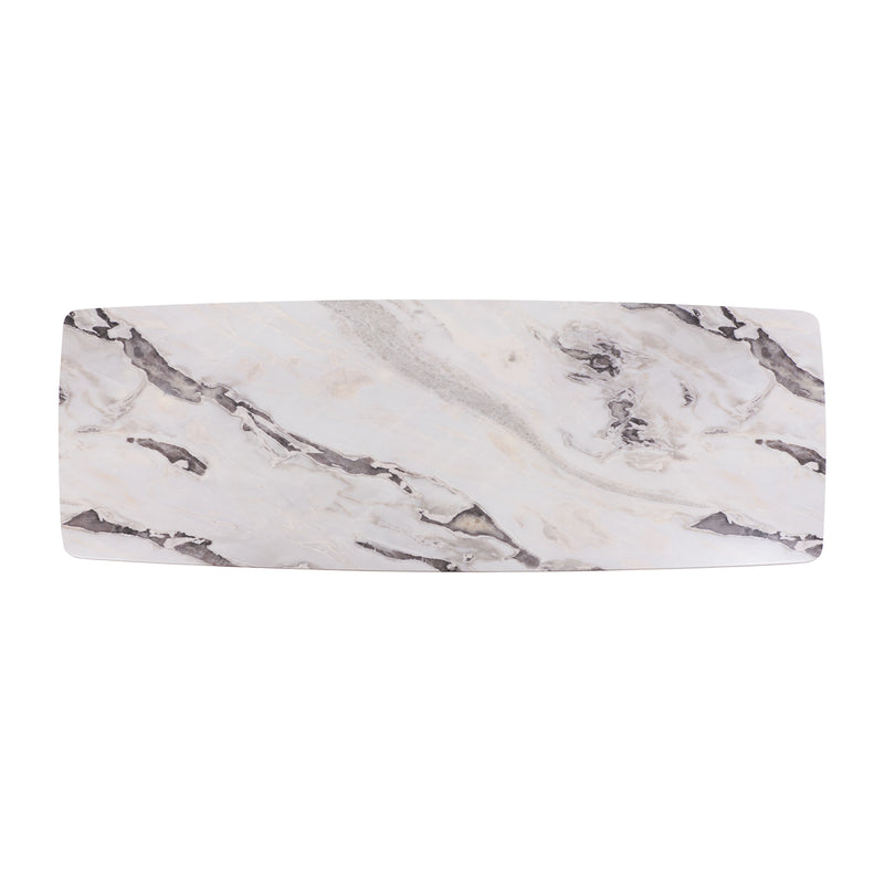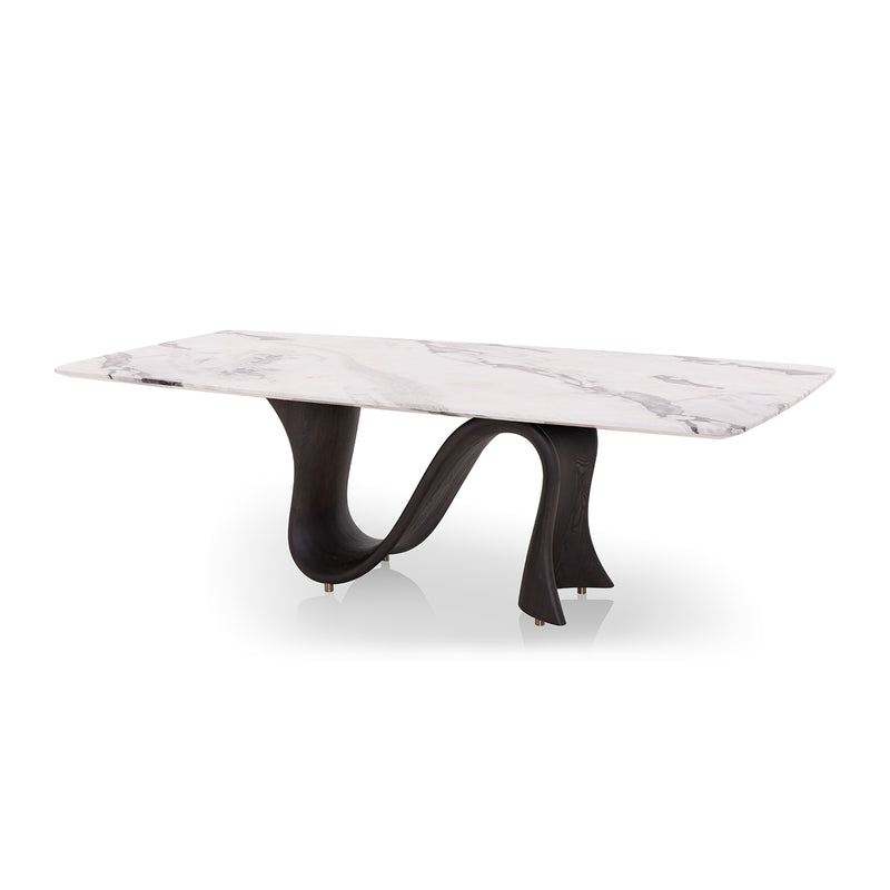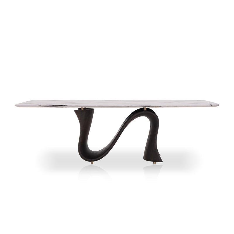 Made with a unique S-shaped solid wood base and natural marble with Picasso marble paper table top, this table exudes a sense of grandeur. Add a touch of elegance and sophistication to your dining space with this dining table.