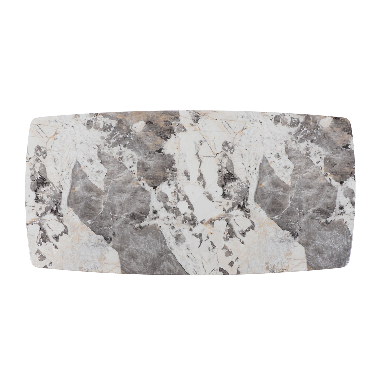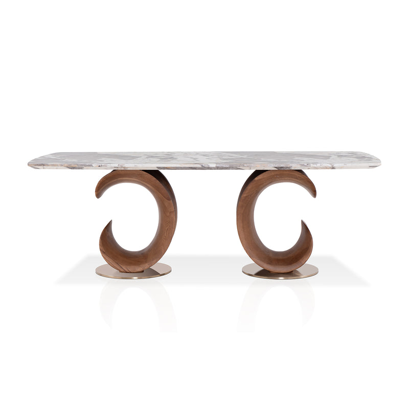 The elegant and sturdy dining table features a natural marble with Pandora marble paper table top and solid wood base. Its unique double C-shaped table base adds stability and enhances the elegance of this dining table, making it the perfect addition to any dining space.